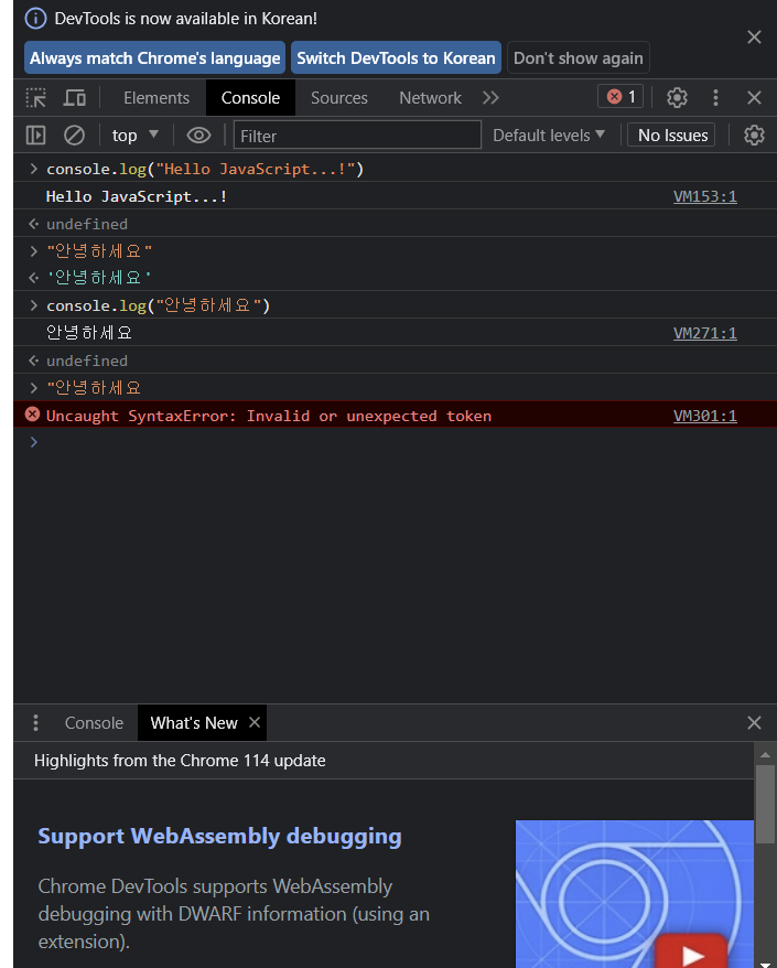 - 콘솔에 출력하기괄호 안에 입력한 값 출력함. 개발자 도구 실행해서 console 탭 클릭하면 확인 가능