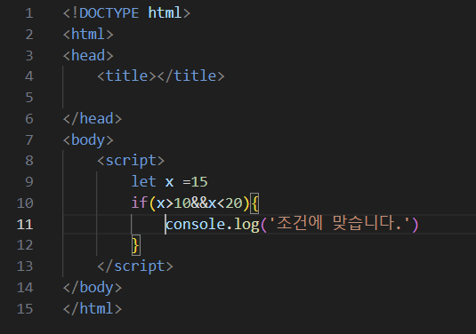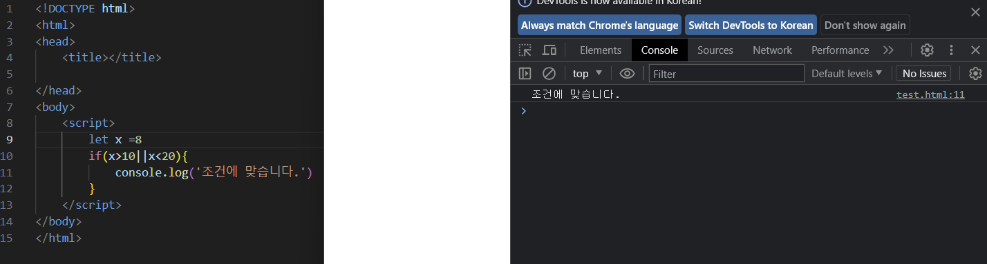 하지만 || 연산자는 조건에 맞다는결과를 띄운다. 그 이유는 or 연산자는 하나라도 true이면 true를 반환하기 때문에 뒤에 나온 조건인 x<20을 만족하기 때문에 조건에 맞다는 결과를 띄운 것이다. 이와 같은 원리로 x=15일 때도 true를 반환한다.