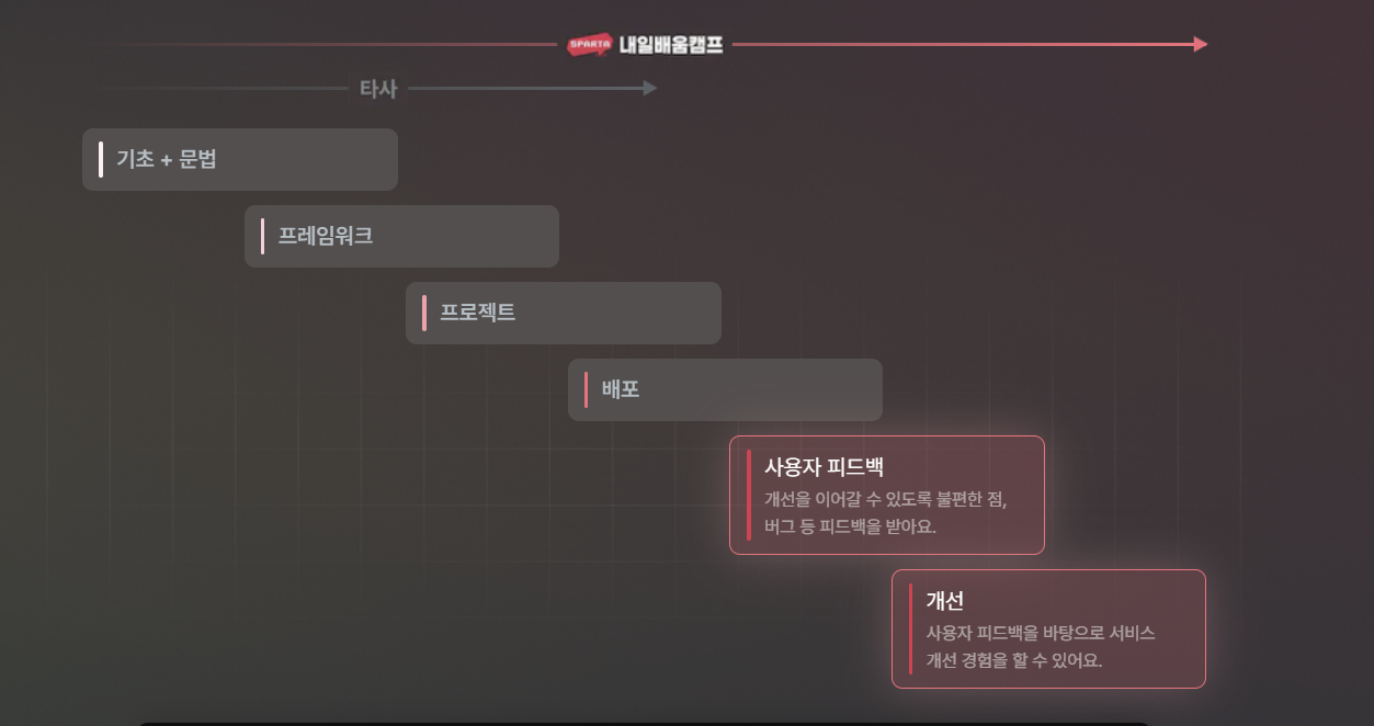 먼저 스파르타코딩클럽은 코딩교육 플랫폼입니다. 전반적인 프로그래밍 언어 및 다양한 개발 강의를 제공하며 개발 관련 지식을 쌓을 수 있는데요. 이런 스파르타코딩클럽에서 진행하는 부트캠프가 바로 내일배움캠프입니다!